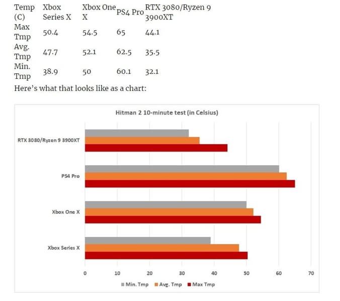 Как можно видеть, у Xbox Series X самая низкая температура выходящего из корпуса воздуха, причём, если с Xbox One X разница невелика и составляет около 5 градусов, от вот PS4 Pro греется на 15 градусов сильнее. Кроме того, у новой приставки Microsoft ещё и существенная разница между средней и минимальной температурой.