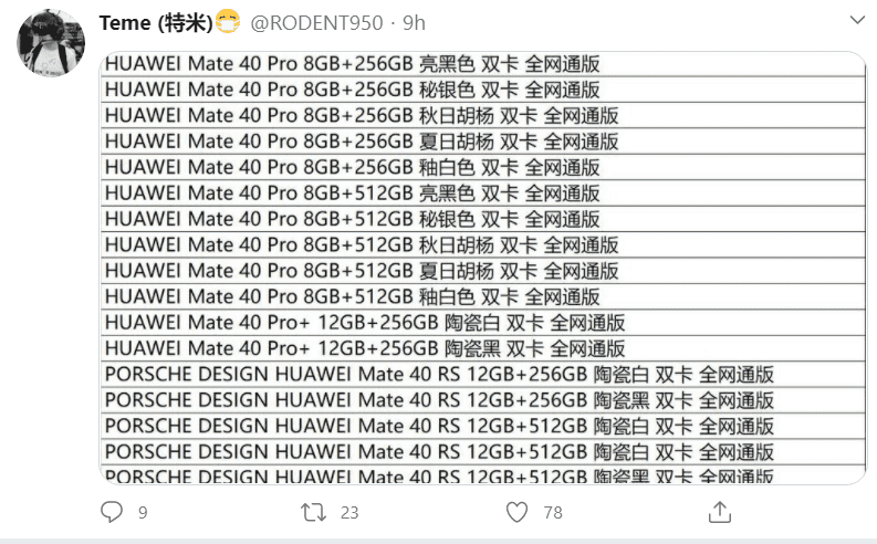 Интересно, что обычный Mate 40 не присутствует в этом перечне, список начинается моделью Mate 40 Pro. Ему приписаны два варианта памяти (8/256 и 8/512 ГБ) и пять вариантов цвета: черный, серебристый, оранжевый, зеленый и белый. У Mate 40 Pro+ 12 ГБ ОЗУ и 256 ГБ флэш-памяти, а цветов два — черный или белый. Те же варианты цвета у Mate 40 RS Porsche Design, но версий памяти уже две — 12/256 ГБ и 12/512 ГБ. К слову, стоимость Mate 40 RS Porsche Design уже известна.