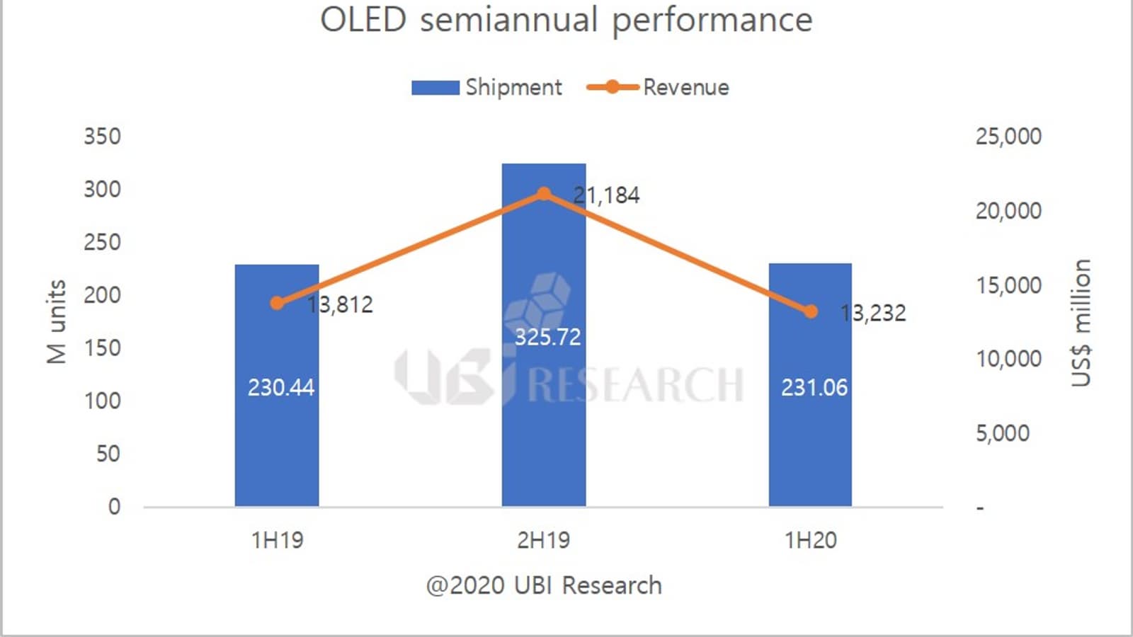 По подсчетам аналитической компании UBI Research, в первом полугодии текущего года было продано 231 млн панелей OLED на сумму 13,2 млрд долларов. Для сравнения: в первом полугодии 2019 года было продано 230 млн панелей OLED на сумму 13,8 млрд долларов.