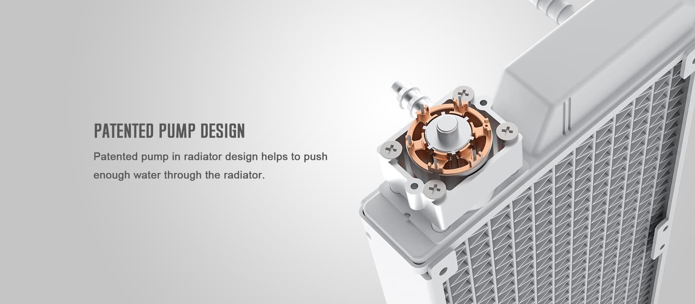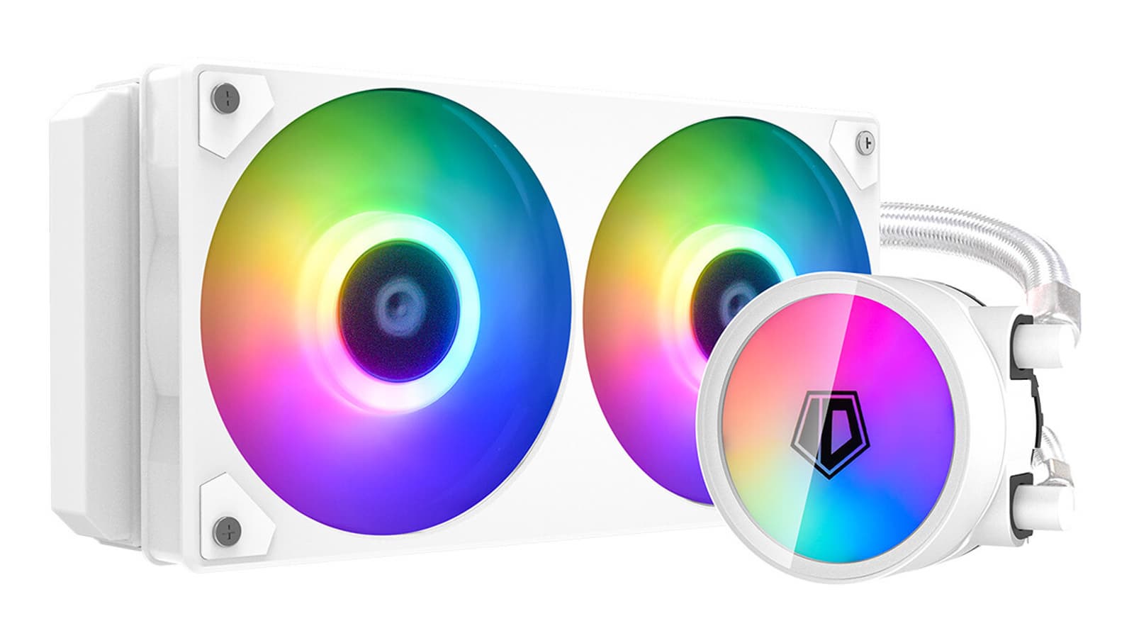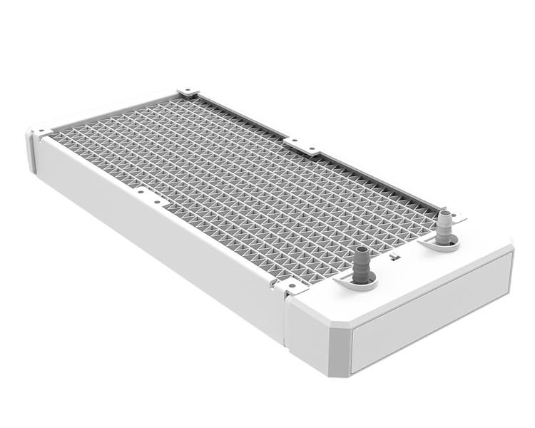 Все компоненты системы жидкостного охлаждения ID-Ice Flow 240 ARGB Snow — водоблок, алюминиевый радиатор размерами 285 х 120 х 30 мм, вентилятор и шланги — окрашены в белый цвет. К особенностям СЖО относится помпа, смонтированная на одной из коротких сторон радиатора, и вентилятор IceFan 240 с двумя крыльчатками в общей рамке. Скорость их вращения регулируется с помощью ШИМ в диапазоне 900-2000 об/мин. Максимальный поток при этом достигает 190 м3/ч.