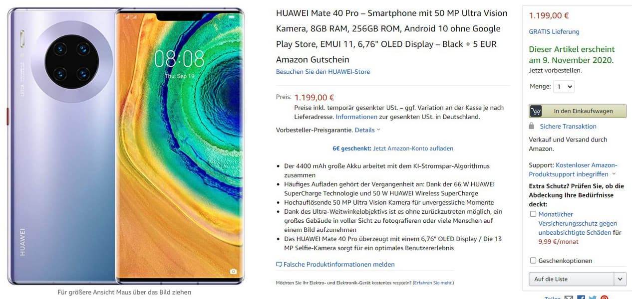 Описание смартфона на странице Amazon говорит о том, что он получил 50-мегапиксельную камеру, 8 ГБ оперативной и 256 ГБ встроенной флэш-памяти, экран OLED диагональю 6,76 дюйма, оболочку EMUI 11, установленную поверх Android 10. Можно отметить, что покупателям Huawei Mate 40 Pro Amazon обещает бонусом купон на… 5 евро.