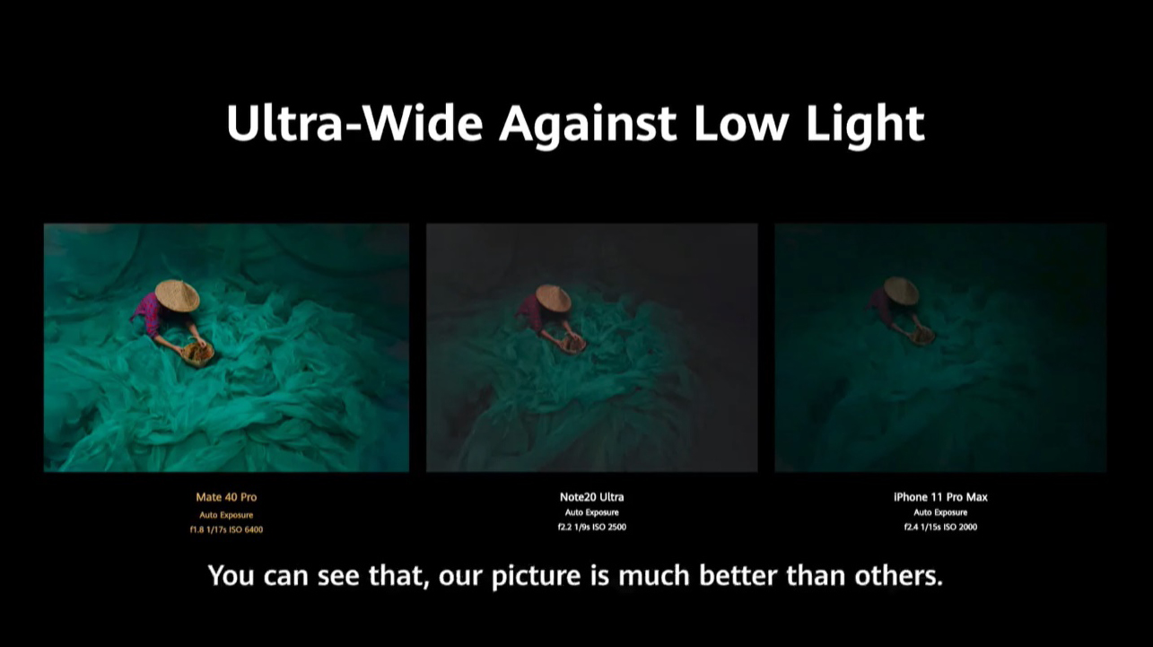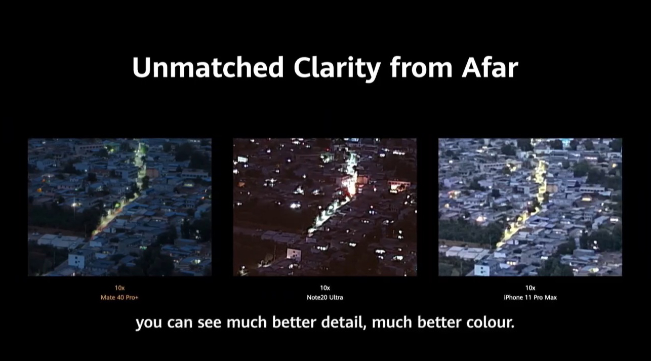 Во время сегодняшнего анонса смартфонов Mate 40 демонстрировались сравнительные фото, сделанные Mate 40 Pro+, Samsung Galaxy Note20 Ultra и iPhone 11 Pro Max в одинаковых условиях. Судя по ним, Mate 40 Pro+ превосходит конкурентов по детализации снимков (в том числе на фото, сделанных с использованием оптического зума) и при съемке в условиях недостаточного освещения.
