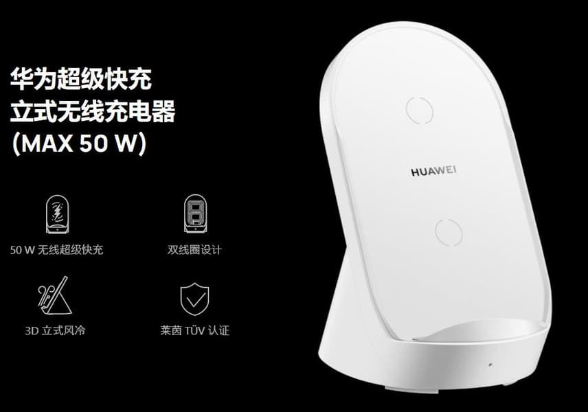 Это беспроводное зарядное устройство имеет вертикальную конструкцию с углом наклона 60 градусов. 50 Вт — это новый рекорд беспроводной зарядки Huawei. Устройство получило две зарядные катушки.