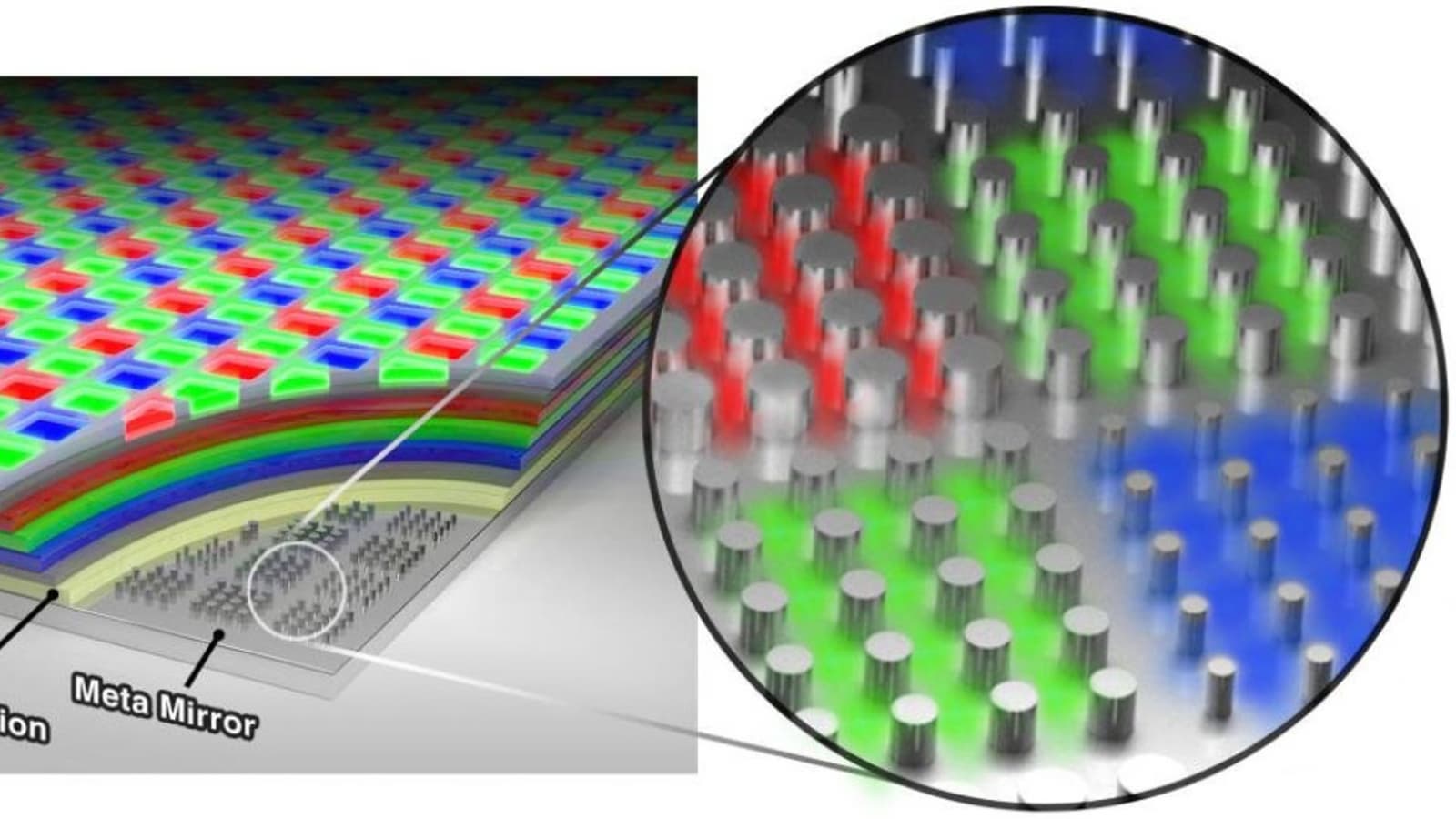 В так называемой «метафотонной» структуре панель OLED изготавливается на базовом отражающем слое из металла с наноразмерным рельефом. Эта поверхность позволять получать цвета за счет резонанса, используя способность света к отражению. Новая структура позволяет получить разрешение до 10 000 пикселей на дюйм, высокую яркость и экономичный производственный процесс.