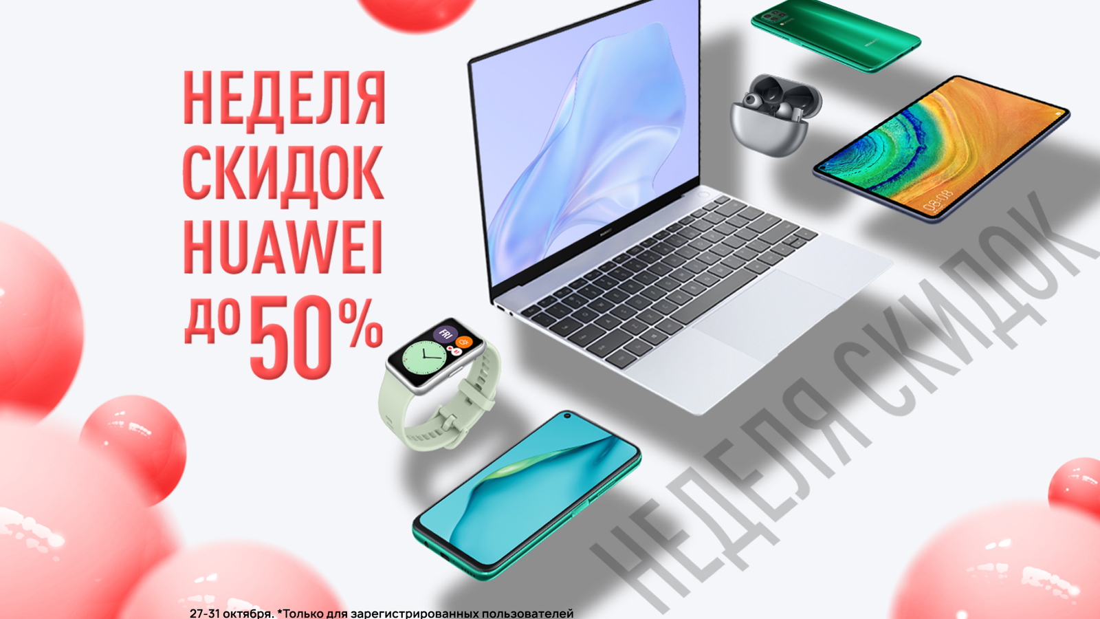 Также с 27 октября предлагаются многочисленные обычные и «двойные» скидки на смартфоны, беспроводные наушники, умные часы, планшеты и ноутбуки. Например, на Huawei P40 Pro даётся скидка в 5 тысяч для всех и дополнительная в 3 тысячи для зарегистрированных пользователей, на Huawei Nova 5T — 3+3 тысячи рублей, на MateBook D 14 — 5 тысяч рублей.