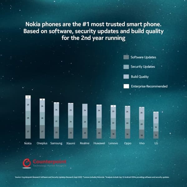 К рейтингу привлекла внимание компания HMD Global, поскольку смартфоны Nokia выбились в лидеры уже второй год подряд. Рейтинг учитывает четыре критерия — программное обеспечение, обновления для системы безопасности, качество сборки и рекомендации для использования в корпоративных целях.