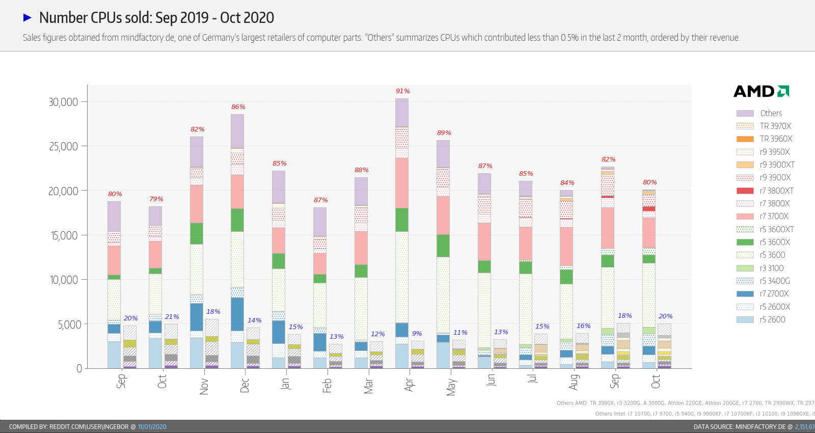 Но даже без них Intel зачастую почти нечего противопоставить конкуренту, что отлично прослеживается в ряде сегментов. К примеру, хорошо известный нам крупнейший немецкий онлайн-магазин Mindfactory за октябрь реализовал вчетверо больше процессоров AMD, чем процессоров Intel. И хотя показатель для последней чуть улучшился, да и вообще это лучший показатель за год, он всё равно весьма плачевный. Если посмотреть на диаграмму, то видно, что в количественном выражении продажи Intel почти не изменились, а вот у AMD они снизились, что явно указывает на то, что пользователи просто решили дождаться новых CPU.