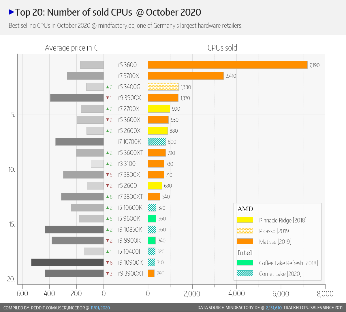 Самыми продаваемыми CPU всё равно остаются Ryzen 5 3600 (7190 штук за месяц) и Ryzen 7 3700X (3410 штук за месяц), тогда как лучший показатель Intel у Core i7-10700K, и он составляет лишь 800 штук за месяц. Даже у Ryzen 7 2700X, который уже можно назвать процессором позапрошлого поколения, результат лучше (990 штук за месяц).