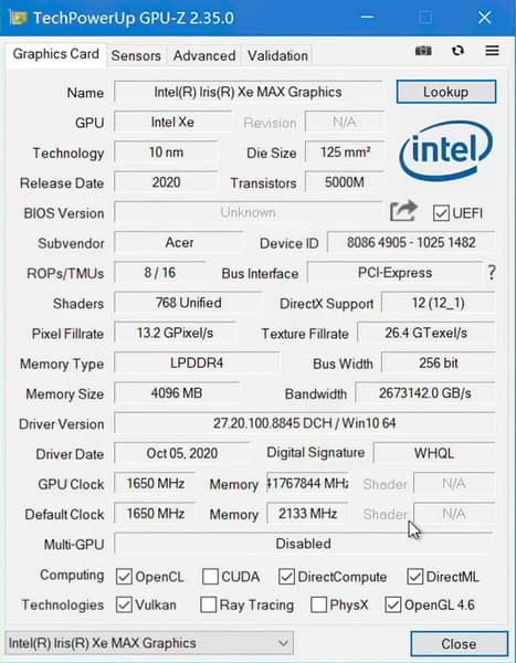 Первые тесты дискретной графики Intel Iris XE Max появились в Сети еще вчера — практически сразу после ее официального анонса. Сейчас — еще один тест. Но сначала — скриншот GPU-Z.