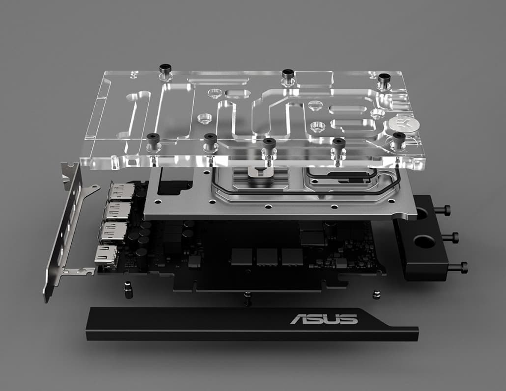 Производитель водоблоков подтвердил, что результатом сотрудничества с Asus стал выпуск трех видеокарт серии GeForce RTX 30 с предустановленными водоблоками. Водоблоки были специально разработаны EK для видеокарт Asus EKWB GeForce RTX 30. Используются две модели водоблоков. Обе относятся к категории водоблоков с полным покрытием, то есть отводят тепло от графического процессора, микросхем памяти и регуляторов напряжения в подсистеме питания.