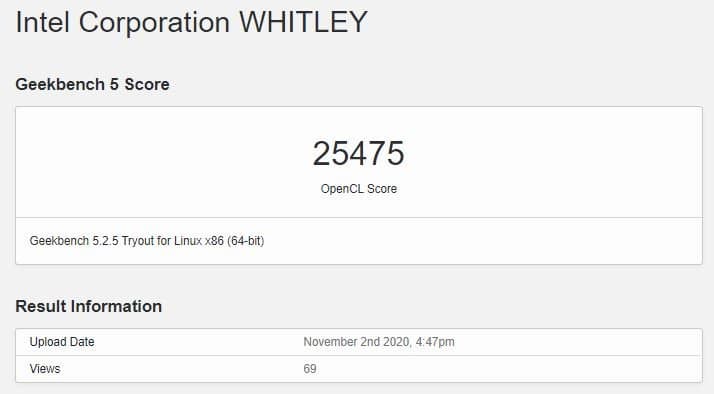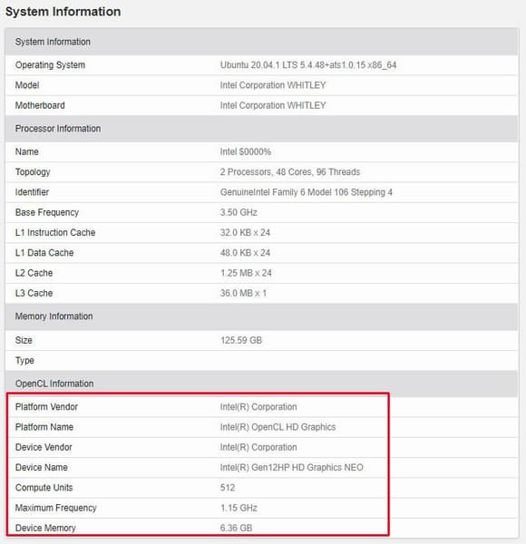 Судя по всему, агрегат под названием «Intel Corporation WHITLEY» используется для отладки – он работает под управлением Ubuntu, оснащен двумя 24-ядерными процессорами и имеет 128 ГБ оперативной памяти. В характеристиках видеокарты самое главное – количество вычислительных блоков. Ранее уже говорилось, что у DG2 их будет 512, сейчас мы имеем этому подтверждение.