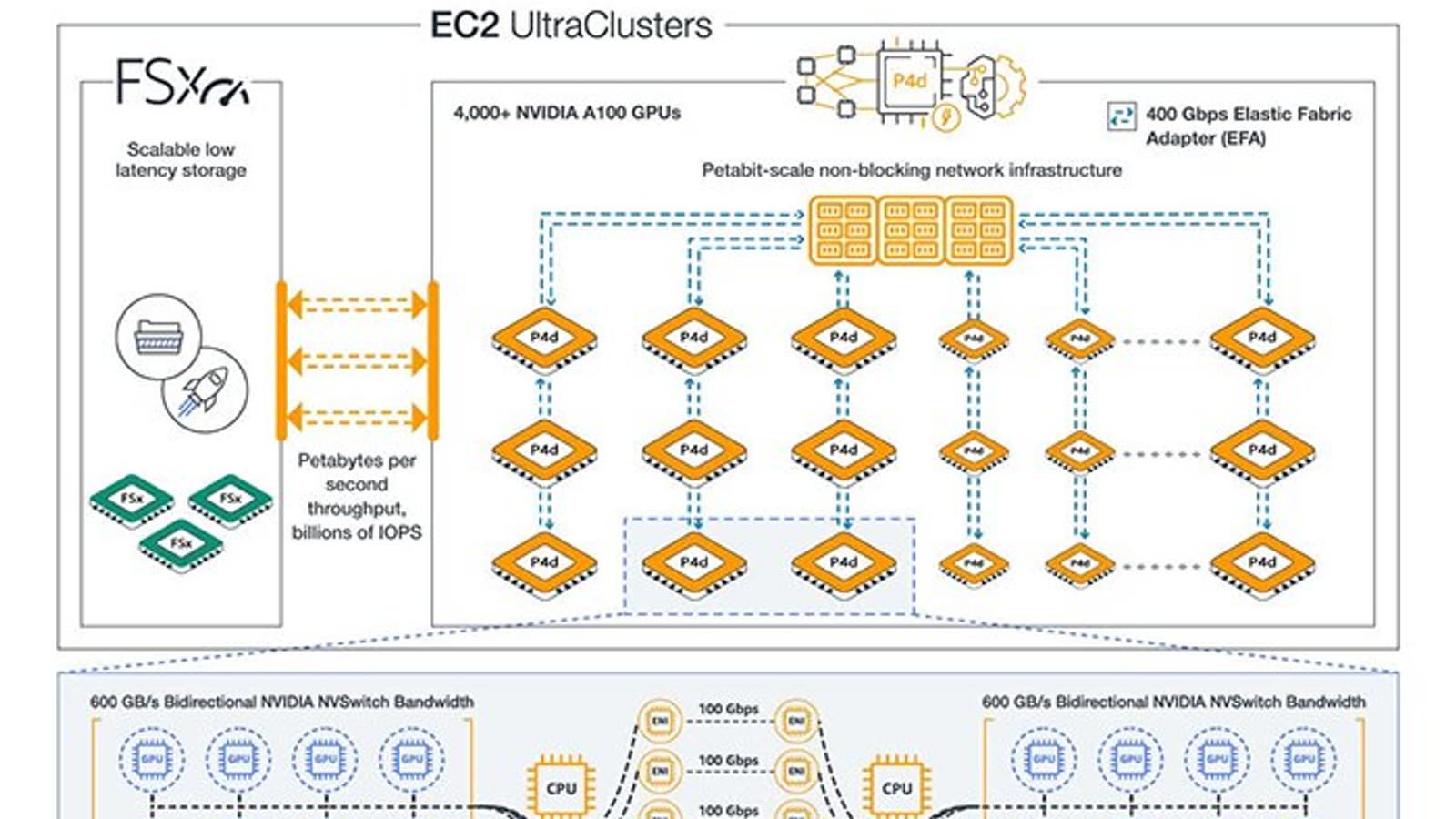Экземпляр P4d обеспечивает доступ к восьми графическим процессорами Nvidia A100 Tensor Core и сети с пропускной способностью 400 Гбит/с (в 16 раз больше, чем у P3). Используя AWS Elastic Fabric (EFA) и Nvidia GPUDirect RDMA (удаленный прямой доступ к памяти), заказчики могут объединять экземпляры P4d в кластеры EC2 UltraClusters. Это позволяет получить доступ к производительности суперкомпьютерного класса, масштабируя инстансы P4d более чем до 4000 графических процессоров A100 (вдвое больше, чем у любого другого поставщика облачных услуг) за счет использования неблокирующей сетевой инфраструктуры петабитного масштаба, разработанной AWS и интегрированной с высокопроизводительным хранилищем Amazon FSx for Lustre.