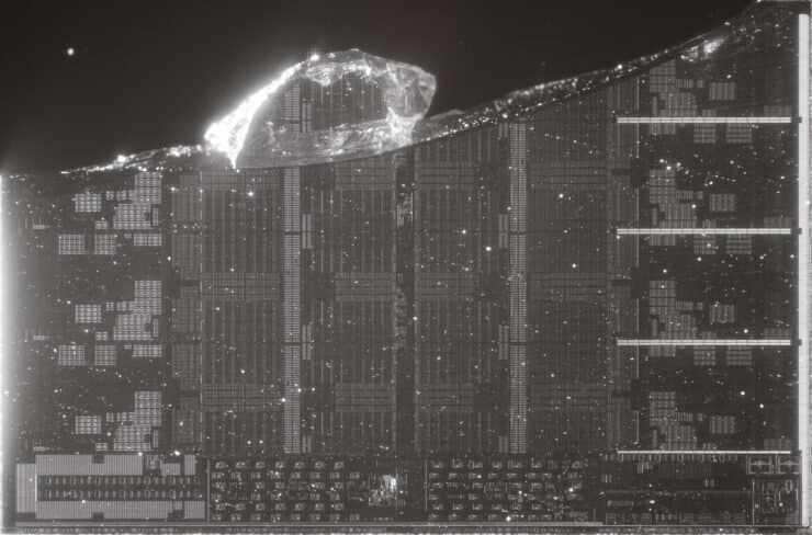 В частности, каждый кристалл теперь не разделён на два модуля: все восемь ядер работают вместе и имеют общий доступ к 32 МБ кэш-памяти третьего уровня (на фотографии указаны мебибайты, но по спецификациям у Ryzen 5 5600X именно 32 МБ кэш-памяти L3), что положительно сказалось на производительности. И сейчас у нас появилась первая возможность взглянуть на фотографию такого кристалла под микроскопом.