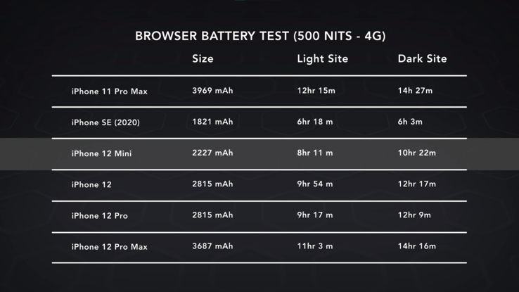 Тест показал, что в сети 4G при яркости экрана 500 кд/м2 время работы смартфона без подзарядки составило 8 часов 11 минут в светлом режиме и около 10 часов 22 минуты в темном режиме. Это худший результат в линейке iPhone 12 и лишь немного лучше, чем у iPhone SE (2020).