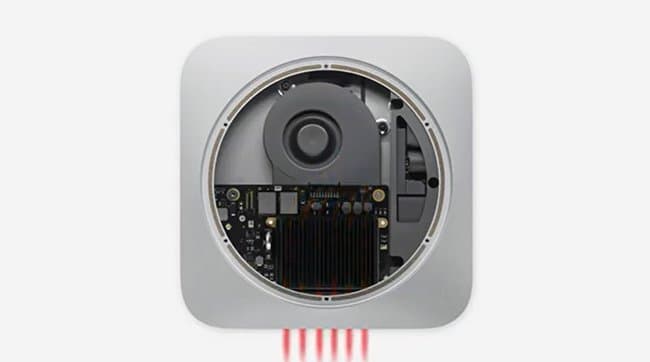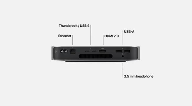 Новый MacMini, как и новый MacBook Pro, оснащается активной системой охлаждения, так что бесшумным таком компьютер назвать нельзя. Зато набор разъемов неплохой: есть два USB-C с интерфейсом USB 4/Thunderbolt, два USB-A 3.1 Gen 2 и HDMI 2.0.
