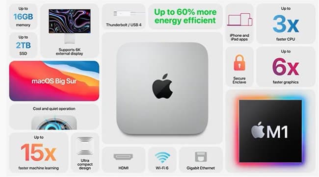 И тем не менее, Mac Mini на базе Arm-платформы Apple M1 – это уже реальность. Само собой, с переходом с архитектуры x86 на Arm устройство стало мощнее: центральный процессор «ускорился» до трех раз, графический процессор – до шести раз.