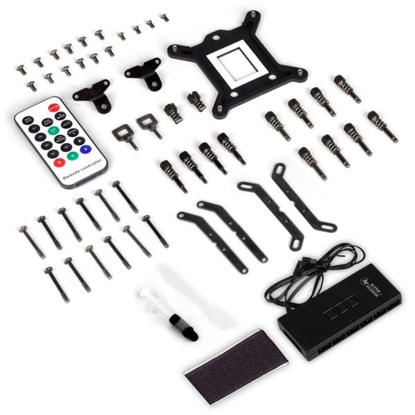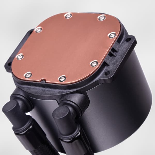 Водоблок с медным основанием совмещен с двухкамерной помпой последнего поколения. Шланги, ведущие к радиатору, заключены в нейлоновую оплетку. Вентиляторы с гидравлическими подшипниками вращаются со скоростью от 800 до 1800 об/мин. Макисмальным оборотам соответствует воздушный поток 78 м3/ч и уровень шума 29,7 дБА. Вентиляторы и орнамент на крышке помпы украшены адресуемой RGB-подсветкой.