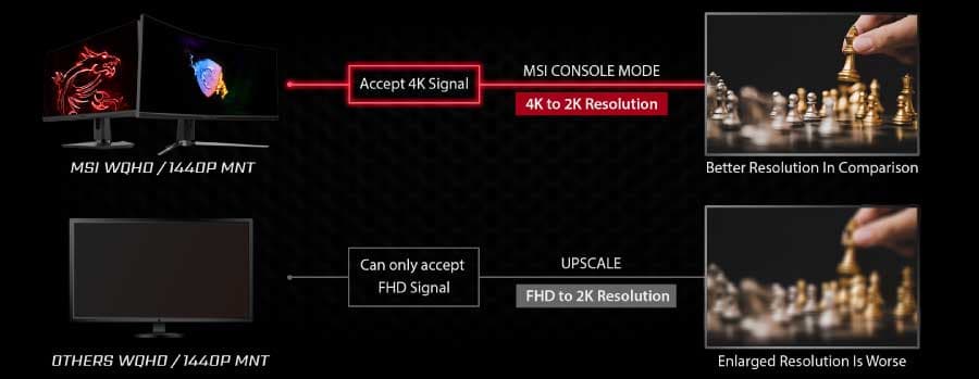 Напомним, при подключении к монитору 1440p можно будет выбрать только разрешение 1080p и положиться на масштабирование в сторону увеличения разрешения, которое ухудшает качество картинки. В мониторах MSI на этот случай будет специальный режим, в котором монитор сообщает консоли, что может принять разрешение 4К и сам выполняет масштабирование в сторону уменьшения разрешения. Кроме того, в этом режиме поддерживается HDR. По словам MSI, это позволяет получить более высокое качество изображения в играх. Наглядно принцип работы показан на иллюстрации: