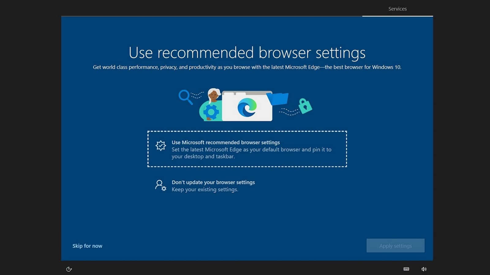 Пока «функция» тестируется на небольшом количестве пользователей. При первоначальной настройке только что купленного компьютера появляется настойчивая рекомендация фирменного браузера Microsoft Edge, фактически полноэкранная реклама. Она появляется после того, как пользователь вошёл в систему и установил необходимые обновления.