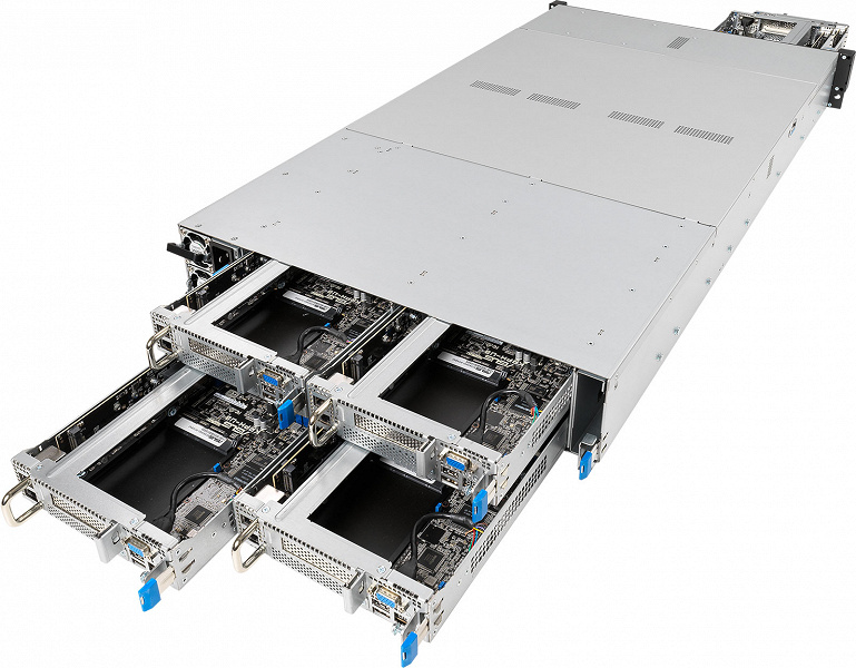 Каждый узел имеет 8 слотов для модулей памяти LRDIMM, куда можно установить суммарно до 512 ГБ памяти, и два слота M.2. В сервере также есть 12 отсеков для накопителей типоразмера 2,5 дюйма с возможностью горячей замены. Все отеки совместимы с накопителями с интерфейсом PCIe и поддержкой NVMe, а шесть их них — и с накопителями с интерфейсом SATA или SAS.