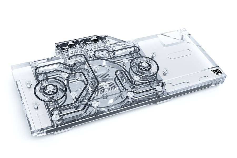 Основание водоблока изготовлено из меди и никелировано. В описании производитель отмечает, что толщина основания составляет всего 5,5 мм, а на участке, прилегающем к GPU, с внутренней стороны сформированы ребра шириной 0,6 мм, образующие массив микроканалов. Будучи водоблоком с полным покрытием, новинка отводит тепло не только от графического процессора, но также от микросхем памяти и от регуляторов напряжения. Для лучшей теплопередачи толщина включенных в комплект термопрокладок составляет всего 1 мм. Материалом крышки служит прозрачный пластик. Водоблок украшен адресуемой подсветкой. Он укомплектован металлической пластиной, закрепляемой на тыльной стороне печатной платы. Габариты водоблока равны 130,0 x 262,5 x 24,5 мм.