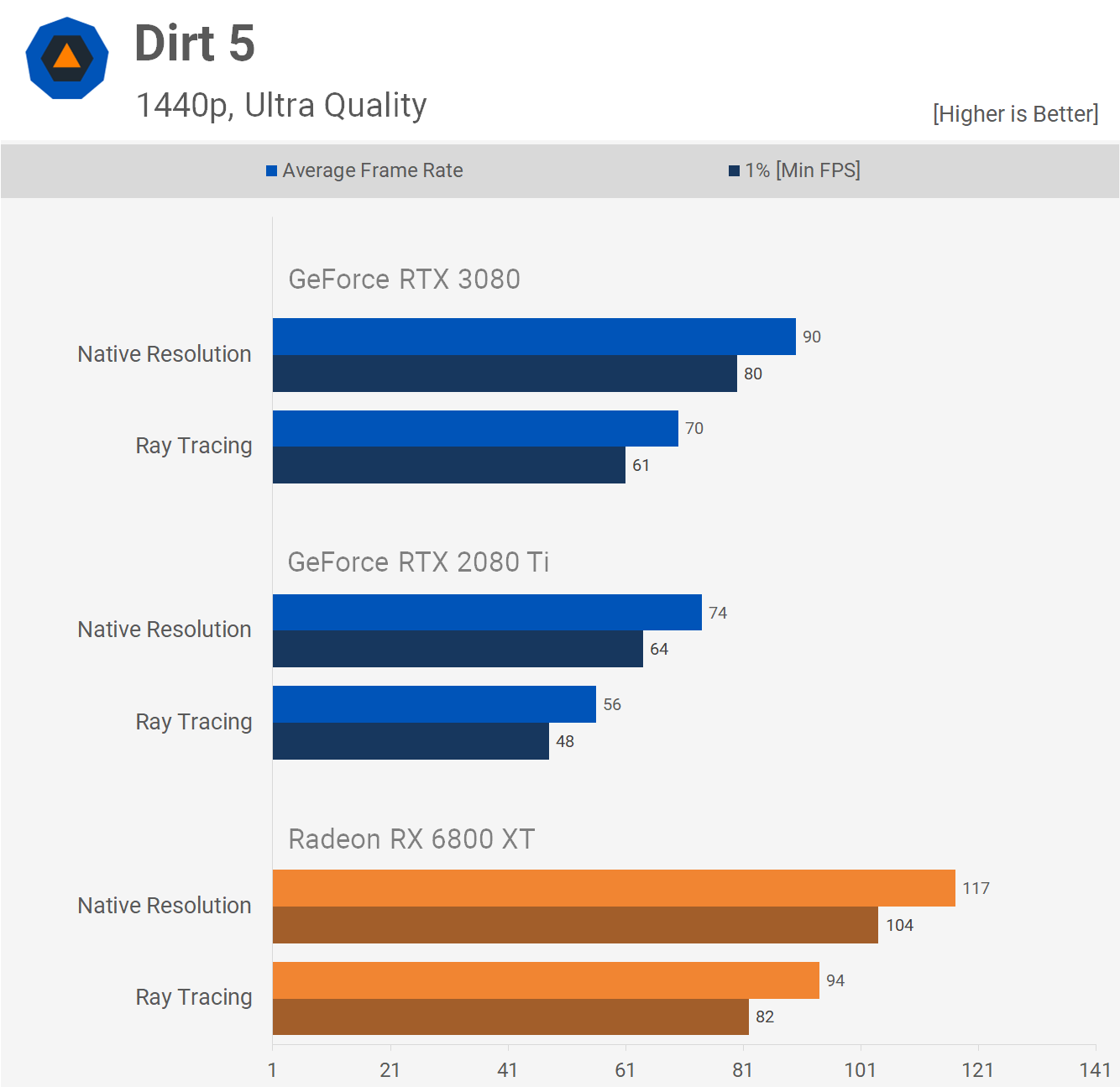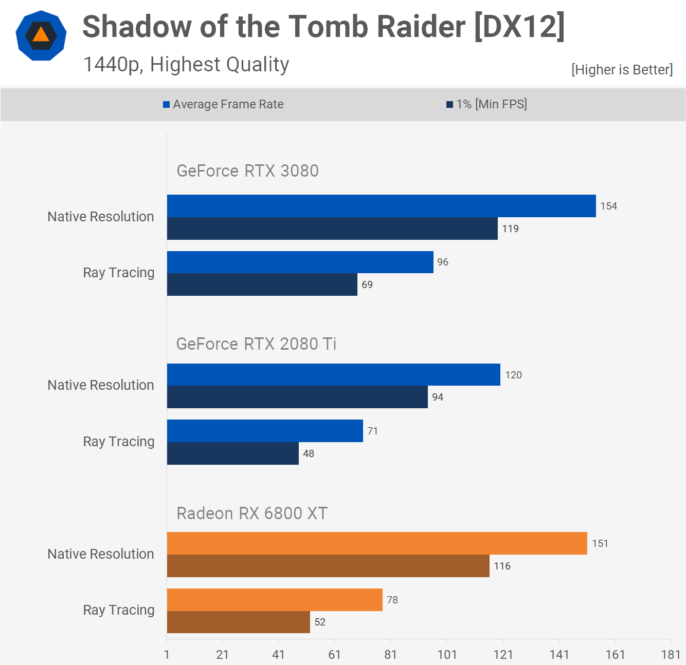 Что касается трассировки лучей, в имеющихся играх падение производительности у карт AMD зачастую больше, чем у адаптеров Nvidia.