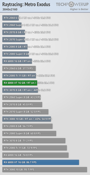 Как можно видеть, всё примерно так и есть. Разве что RX 6800 XT всё же несколько уступает конкуренту, хотя разница лишь в несколько процентов. А вот младший адаптер AMD опережает соперника почти на 9%, хотя нельзя сказать, что это огромный разрыв. Уточним: всё это о разрешении 4K.