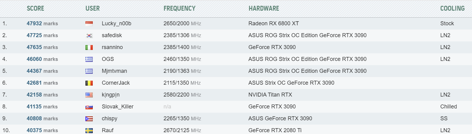 Видеокарта смогла набрать 47932 балла. При этом она всего на 225 баллов, но все же обошла предыдущего рекордсмена, использовавшего карту Asus ROG Strix RTX 3090 OC, охлаждаемую жидким азотом.