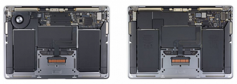 Переход на новую SoC M1 с мизерным энергопотреблением делал возможным сделать новые MacBook Air и MacBook Pro 13 еще компактнее и легче. Все-таки энергопотребление на уровне 10 Вт – это гораздо меньше энергопотребления платформ Intel. Значит, можно урезать/упростить подсистемы питания и охлаждения. Но в компании поступили иначе.