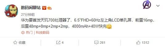 Перспективной новинке Huawei, помимо Dimensity 700, приписан экран диагональю 6,5 дюйма разрешением Full HD+ с кадровой частотой 60 Гц и одинарной врезанной камерой разрешением 16 Мп, аккумулятор емкостью 4000 мА·ч с поддержкой быстрой зарядки мощностью 40 Вт и основную камеру с датчиками разрешением 48, 8, 2 и 2 Мп. В общем, характеристики этой модели – на границе решений начального и среднего уровня, мало соответствующие статусу nova 8.