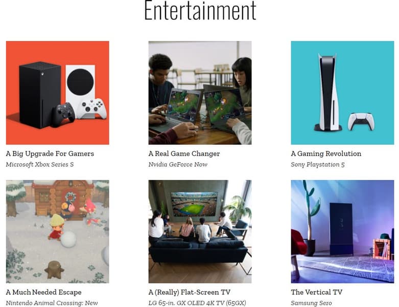 Помимо двух игровых приставок в разделе «Развлечения» перечня 100 лучших изобретений 2020 года представлены телевизоры LG GX OLED 4K TV (65GX) и вертикальный Samsung Sero, сервис Nvidia GeForce Now и игра Nintendo Animal Crossing: New Horizons.