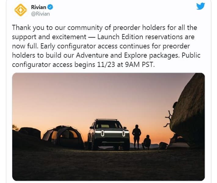 Компания Rivian подтвердила, что уже распродала все «бронирования» на первую версию своего электрического пикапа. И это без предоставления широкой публике доступа к конфигуратору.