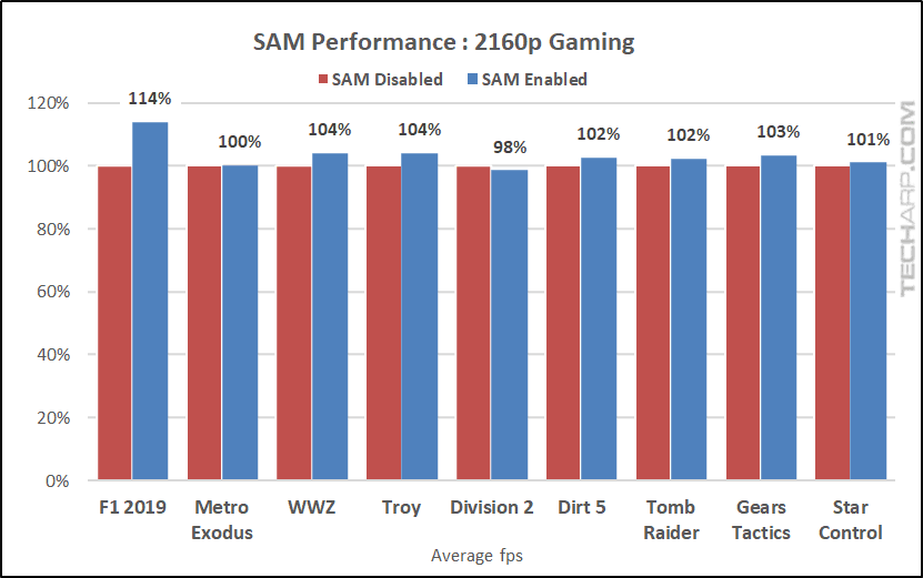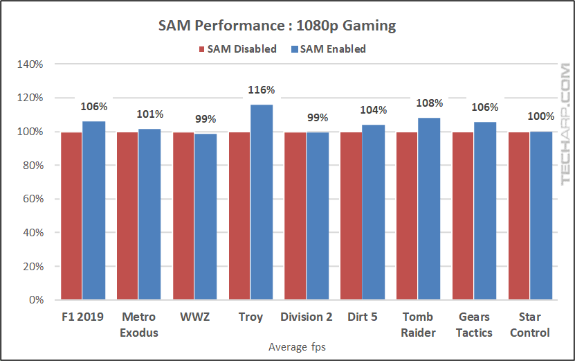 Технология AMD Smart Access Memory (SAM) дебютировала с видеокартами Radeon RX 6000. Она позволяет процессору получить полный доступ к памяти видеокарты, что обеспечивает прирост в играх.