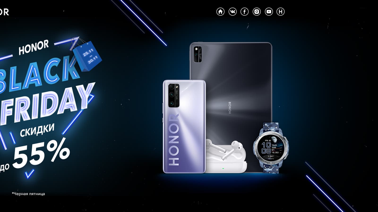 Недавно отделившийся от Huawei бренд Honor объявил о запуске масштабной распродажи «Чёрная пятница 2020». Акция проводится не только в официальном российском онлайн-магазине бренда, но и у нескольких крупных ритейлеров.