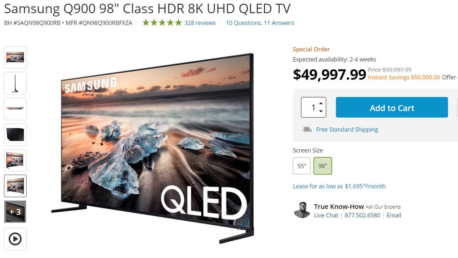 Изначально Q900 предлагался за 100 тысяч долларов, со скидкой он подешевел ровно вдвое – это хорошее предложение для тех, у кого есть столько денег на флагманский телевизор Samsung. Все характеристики этой модели перечислять нет смысла – речь о настоящем флагмане без оговорок, поэтому полное описание может занять несколько десятков абзацев. Отметим лишь, что разрешение составляет 7680 х 4320 пикселей, поддерживаются технологии HDR10, HDR10+ и HLG, есть встроенные адаптеры Wi-Fi и Bluetooth, четырехъядерный процессор, голосовой помощник Bixby, полноценный web-браузер, технология Screen Mirroring, 4 порта HDMI и три USB и много всего другого.