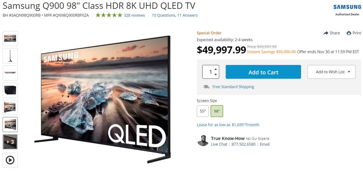 Аттракцион невиданной щедрости устроило североамериканское отделение компании Samsung для местных покупателей – к старту сезона распродаж и традиционной «Черной пятнице» флагманский 98-дюймовый телевизор Samsung Q900 предложен с невиданной скидкой в размере 50 тысяч долларов! Пользователи, присматривавшиеся к этой модели, теперь могут сильно сэкономить, и на оставшиеся деньги купить, например, кроссовер Tesla Model Y. Еще на PlayStation 5 останется.