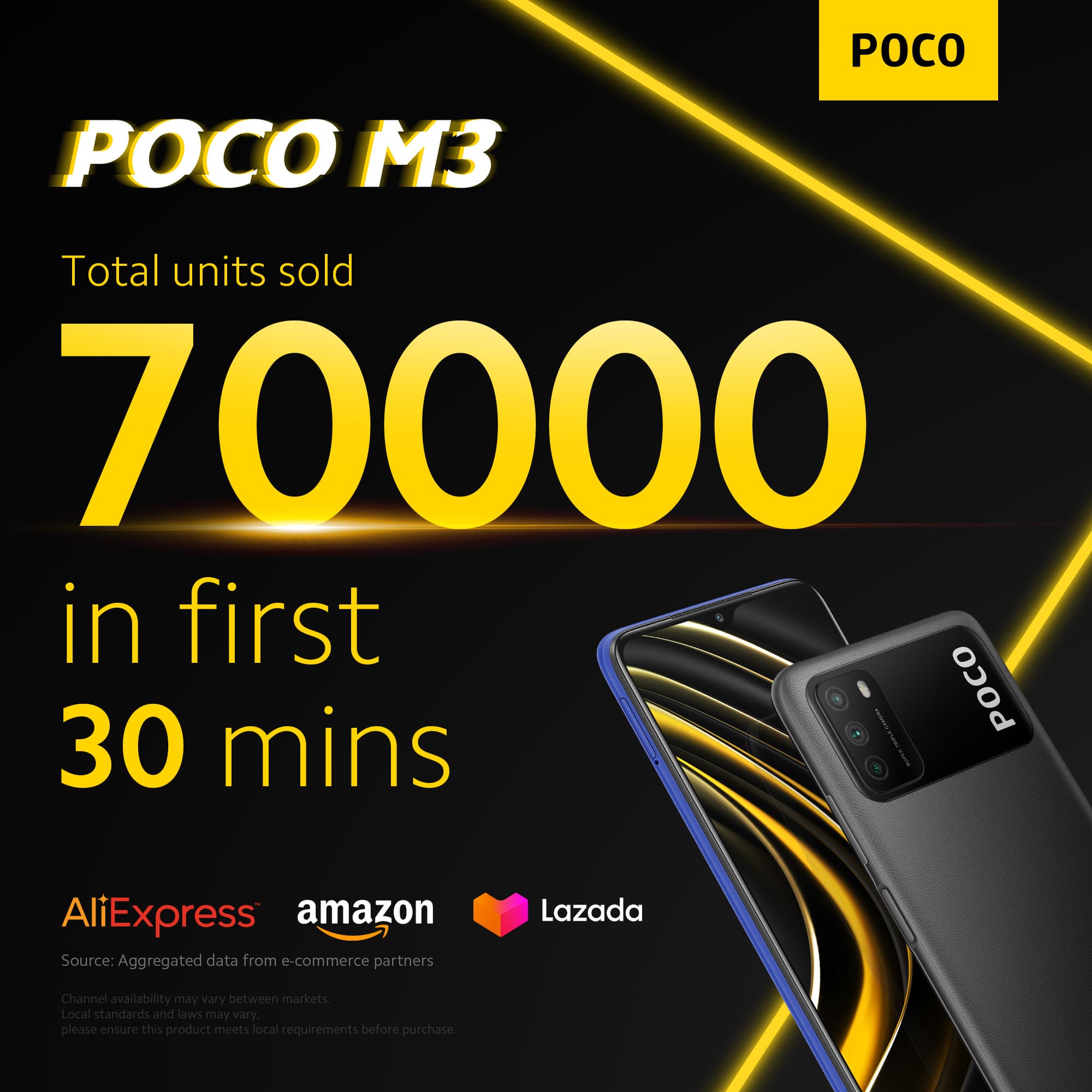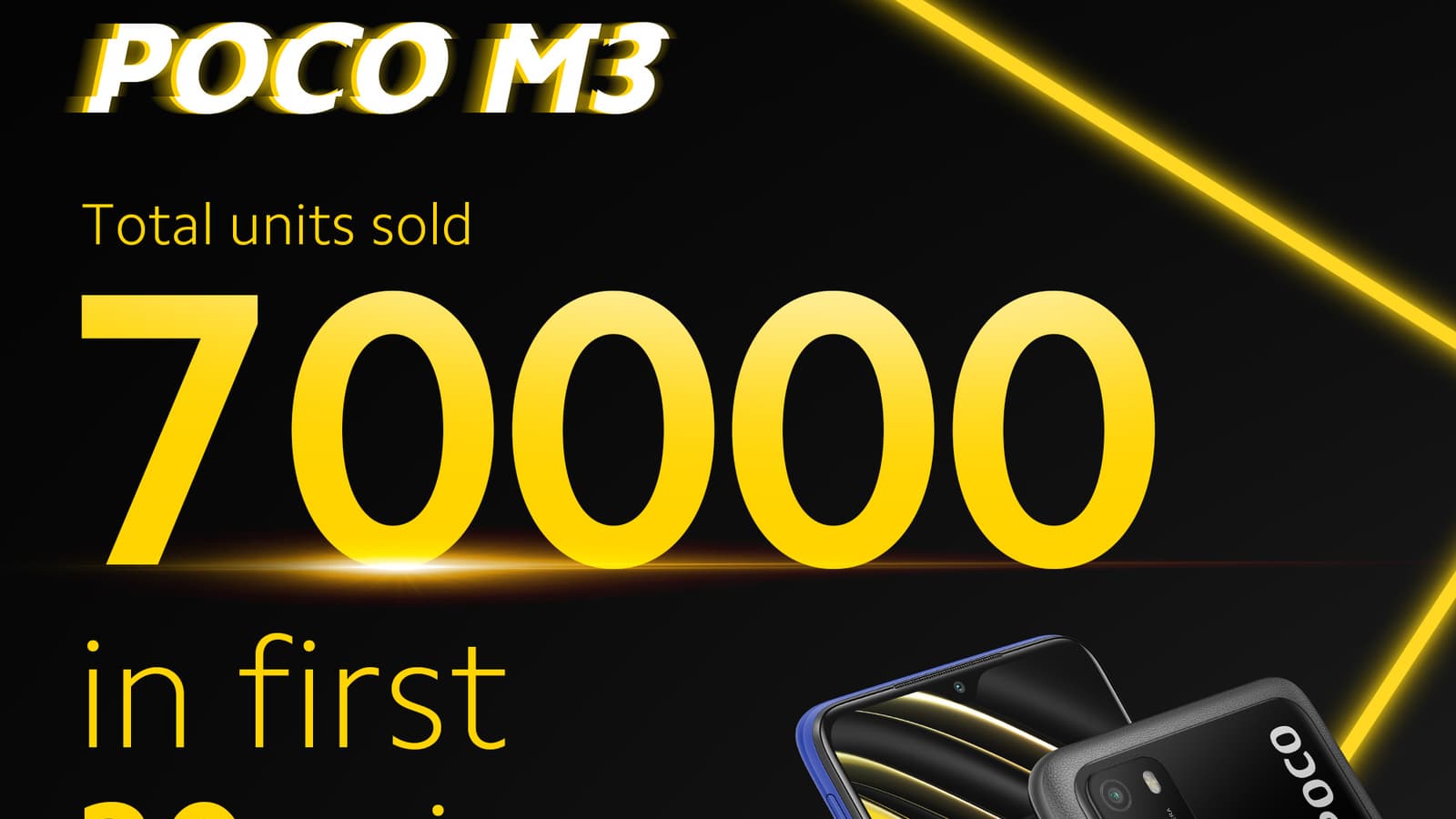 Смартфон Poco M3 дебютировал на этой неделе, и в первый же день продаж стал хитом: в официальном сообщении бренда в Twitter говорится, что всего за полчаса было продано 70 000 смартфонов. Это ли не успех?