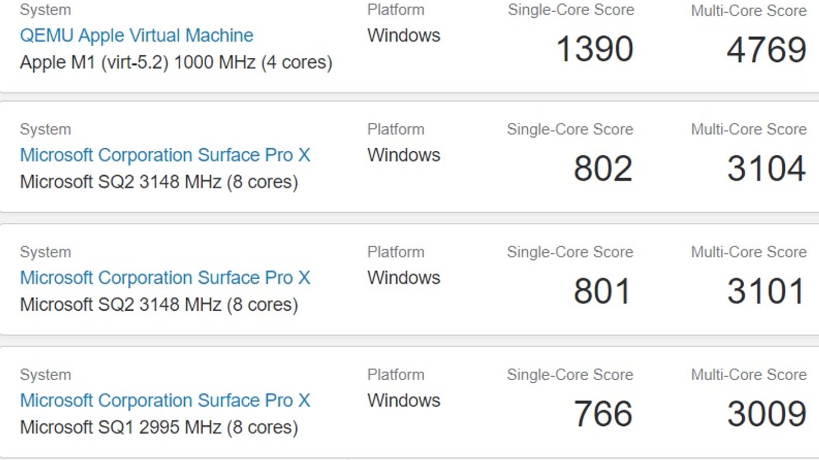 Оказалось, что ноутбук Apple с «виртуализированной» Windows 10 on ARM работает быстрее, чем Surface Pro X: 1390 баллов в однопоточном тесте и 4768 баллов в многопоточном против 802 и 3104 баллов соответственно. Соответственно, если бы обошлось без виртуализации, что Windows на ноутбуке Apple работала бы еще быстрее.