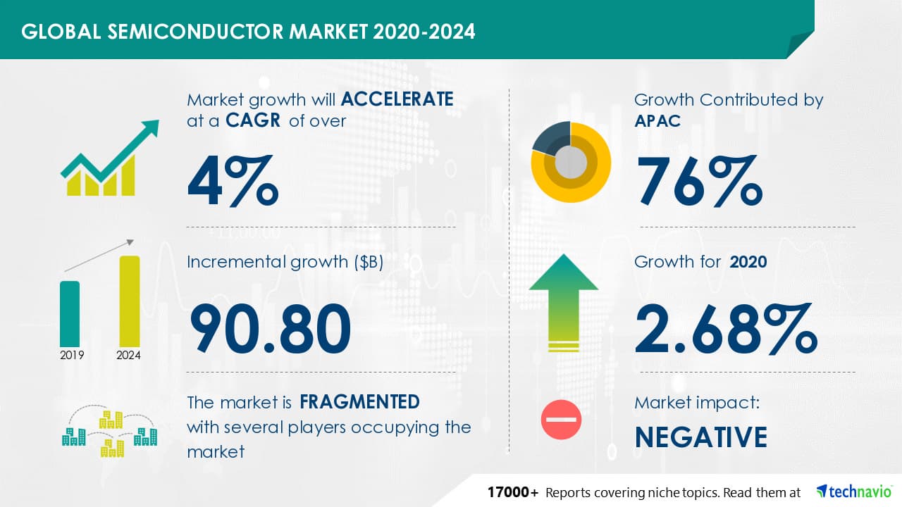 Аналитическая компания Technavio подготовила прогноз, относящийся к рынку полупроводниковой продукции. По мнению аналитиков, в ближайшие годы этот рынок будет уверенно расти. Говоря точнее, в период с 2020 по 2024 год среднегодовой рост превысит 4%. Если этот прогноз оправдается, указанный рынок вырастет на 90,80 млрд долларов. Что касается текущего года, рост будет ниже, чем в 2019 году относительно 2018.