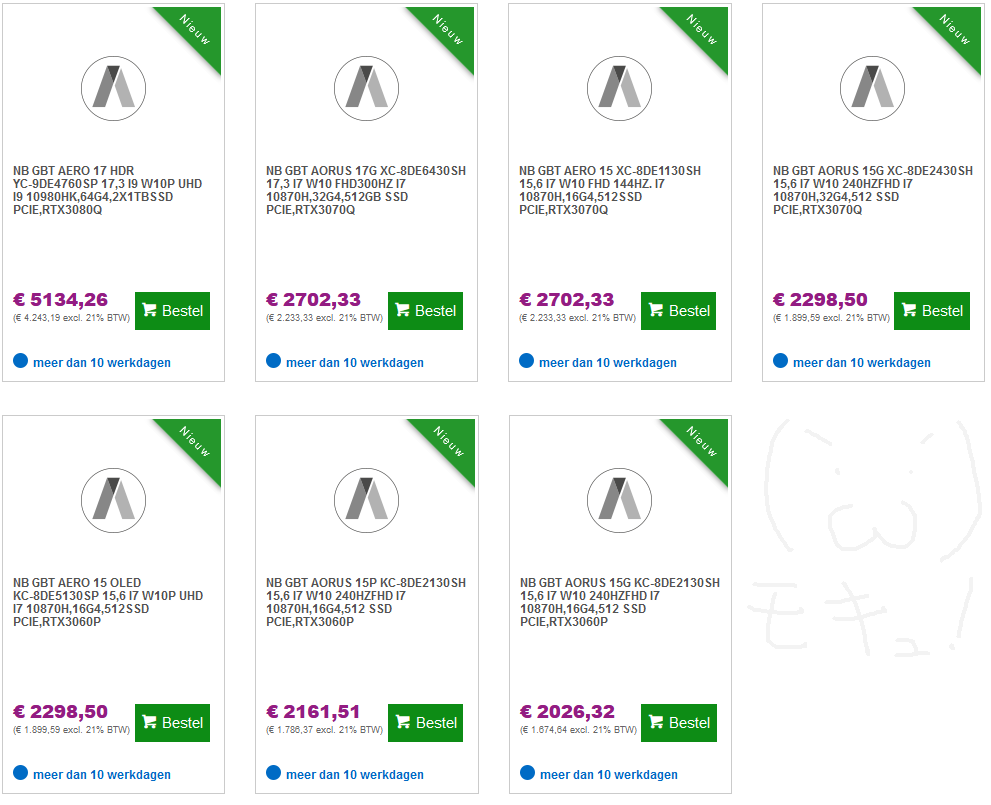 Мобильные видеокарты GeForce RTX 3000 ещё не были представлены, но в Сети о них всё больше информации. К примеру, источник обнаружил в некоем голландском магазине сразу несколько уже добавленных в ассортимент мобильных ПК Gigabyte Aorus с мобильными адаптерами Nvidia Ampere.
