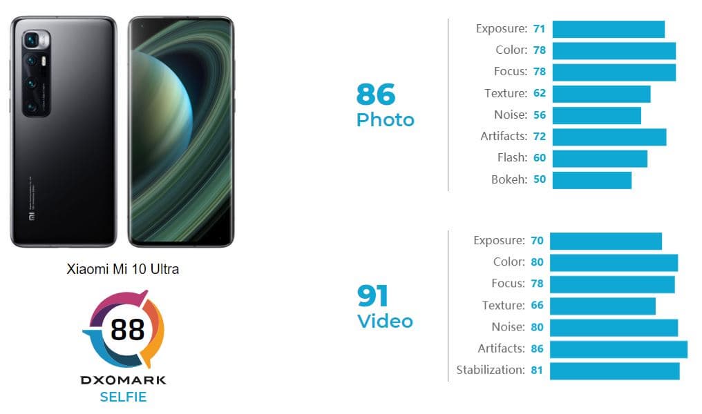 Специалисты DxOMark опубликовали тест фронтальной камеры смартфона Xiaomi Mi 10 Ultra. И если по тестам основной камеры эта модель входит в Топ-3 лучших моделей в мире, то от фронтальной камеры суперснимков ждать не приходится: в соответствующем рейтинге смартфон занял всего лишь 22 место. С 88 баллами на большее рассчитывать не пришлось.
