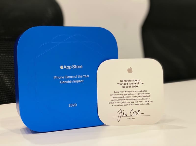 Фотографиями награды поделились разработчики игр Flexibits, Genshin Impact и Share the Meal на своей страничках в Twittter. Изготовленная из полностью переработанного алюминия награда содержит логотип App Store и название приложения-победителя.