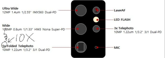 - Широкоугольная камера: 108-мегапиксельный датчик ISOCELL HM3, размер пикселя 0,8 мкм, оптический формат 1/1,33 дюйма, система автофокуса Nona Super-PD