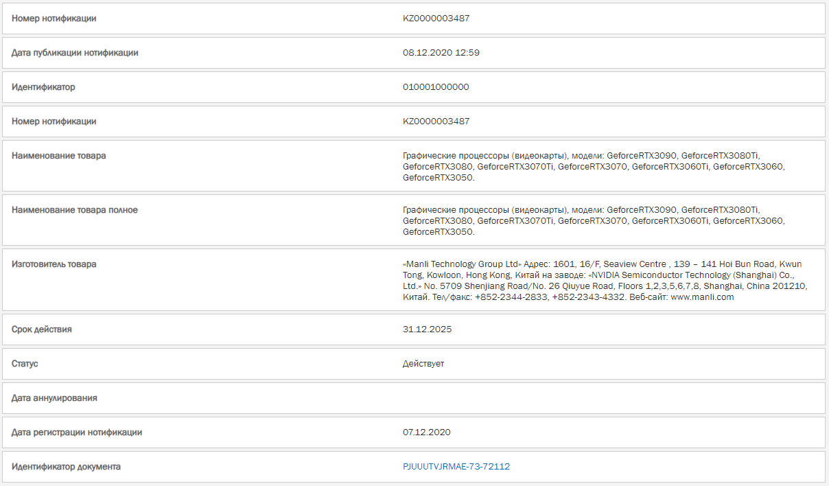 Компания Manli зарегистрировала в базе Европейской экономической комиссии (ЕЭК) свои «графические процессоры (видеокарты), модели». Так как Manli является партнером Nvidia, то речь о моделях на базе видеокарт Nvidia. В перечне – восемь представителей линейки GeForce RTX 30. Учитывая, что на данный момент официально представлены только четыре, остальные четыре – перспективные новинки. Это GeForce RTX 3080 Ti, RTX 3070 Ti, RTX 3060 и RTX 3050. Таким образом, мы имеем подтверждение, что все эти видеокарты действительно готовятся к выпуску.