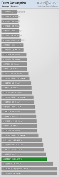 Также стоит отметить, что RX 6900 XT потребляет меньше энергии, причём даже RTX 3080 обходит новинку AMD, и это очень впечатляет. Особенно это впечатляет, если обратить внимание, что примерно столько же потребляют GeForce GTX 1080 Ti и Radeon RX Vega 64, которые примерно вдвое медленнее.