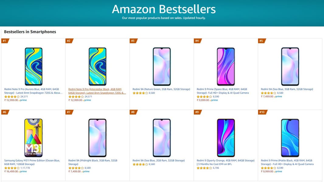 Рейтинг возглавляет Redmi Note 9 Pro, там же представлены Redmi Note 9 Pro Max, Redmi Note 9, Redmi 9 Prime, Redmi 9 и Redmi 9A . Единственным телефоном другого производителя является Samsung Galaxy M31 Prime Edition, который занял шестую строчку.