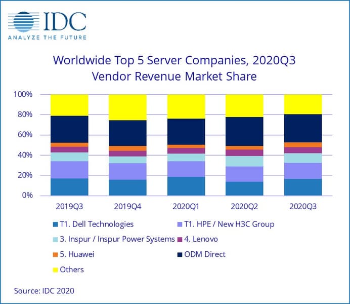 Однозначного лидера рынка в IDC назвать затрудняются, поскольку разрыв в долях рынка между Dell Technologies и HPE/New H3C Group оказался меньше 1%, что сопоставимо с погрешностью расчетов. Доля Dell Technologies, приведенная в отчете, равна 16,65%, доля HPE/New H3C Group — 16,94%. Далее следует компания Inspur/Inspur Power Systems с 9,37%, а за ней — Lenovo с 5,88%, а замыкает первую пятерку Huawei с 4,87%. Интересно, что Huawei удалось нарастить продажи за год на 19,9%, что является лучшим показателем в пятерке.