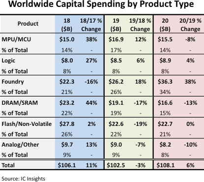 По оценке аналитиков, мировые капитальные вложения, связанные с выпуском полупроводниковой продукции, в этом году составят 108,1 млрд долларов. Это на 6% больше, чем в 2019 году, когда капиталовложения составили 102,5 млрд долларов. Кстати, показатель 2019 года был на 3% меньше показателя за 2018 год, равного 106,1 млрд долларов. В свою очередь, в 2018 году был зафиксирован рост капиталовложений на 11%.