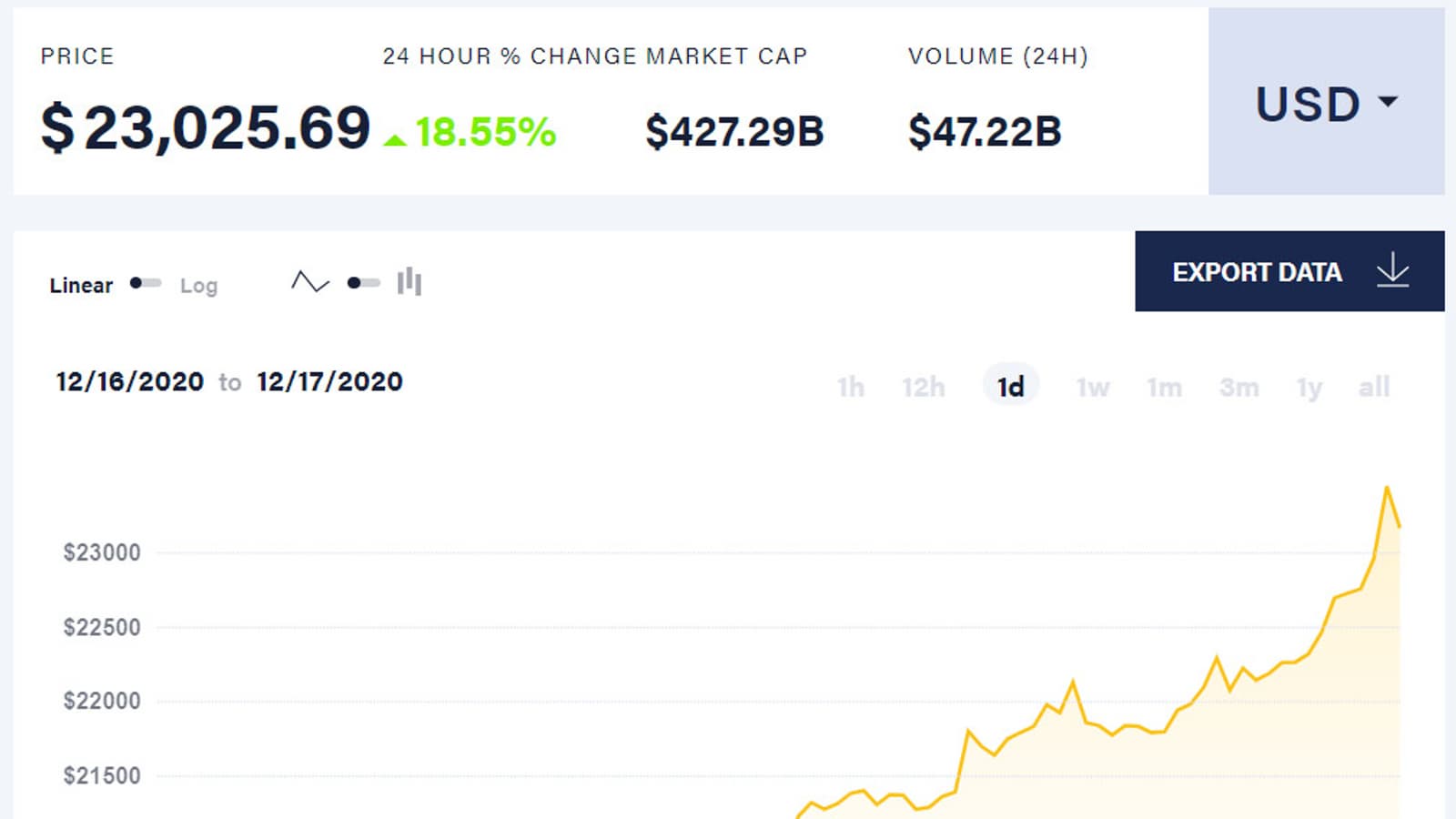 Вчера мы сообщили, что криптовалюта Bitcoin взяла отметку 20 000 долларов и прогнозировали дальнейший рост. Он не заставил себя ждать. Сегодня за единицу самой известной криптовалюты уже давали больше 23 000 долларов. На момент написания этих строк курс откатился примерно до 22 500 долларов.