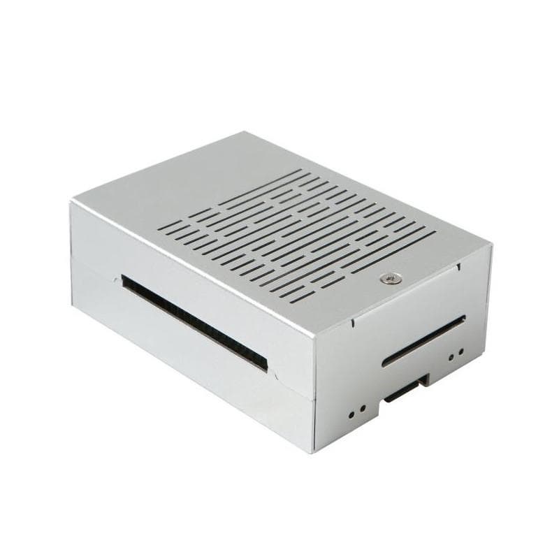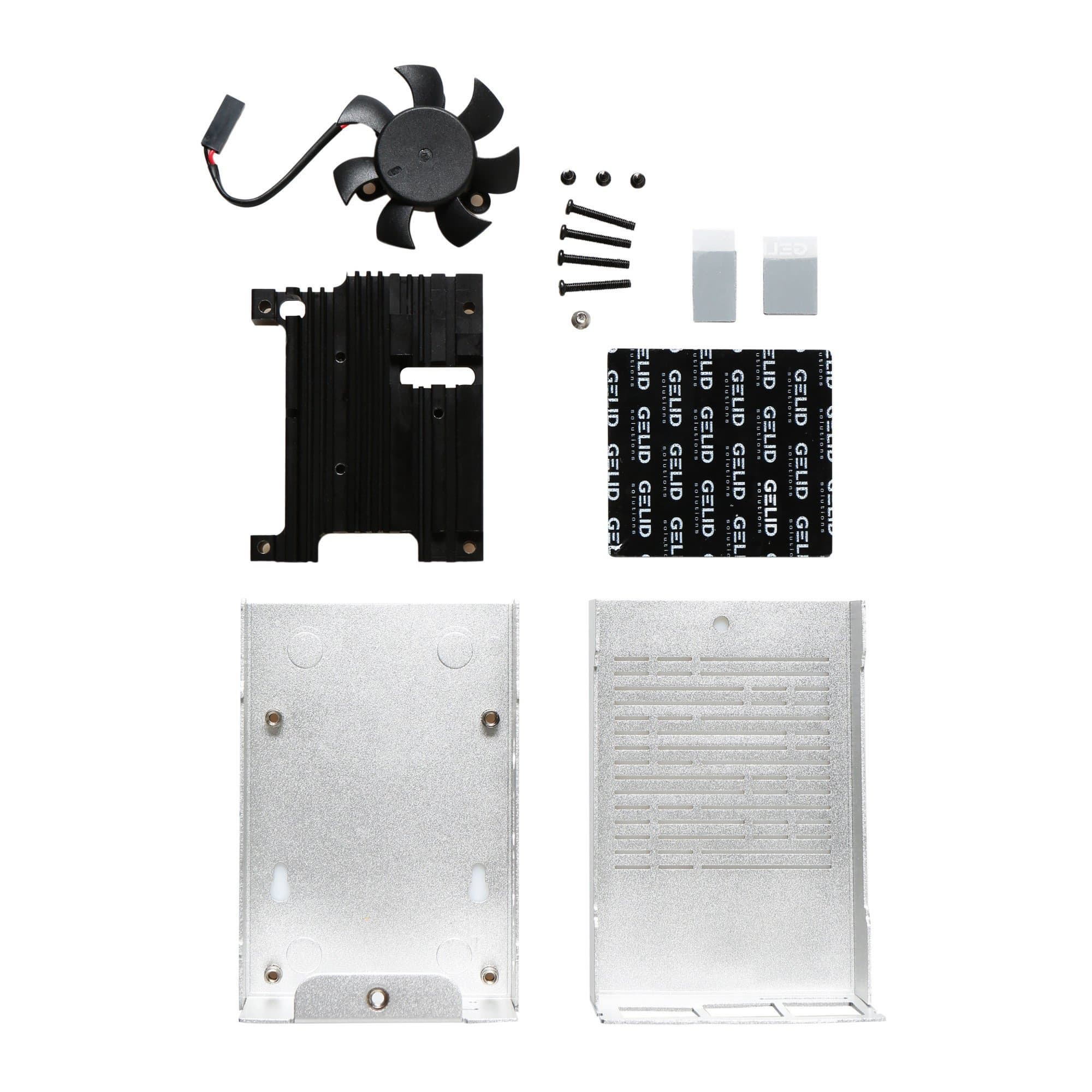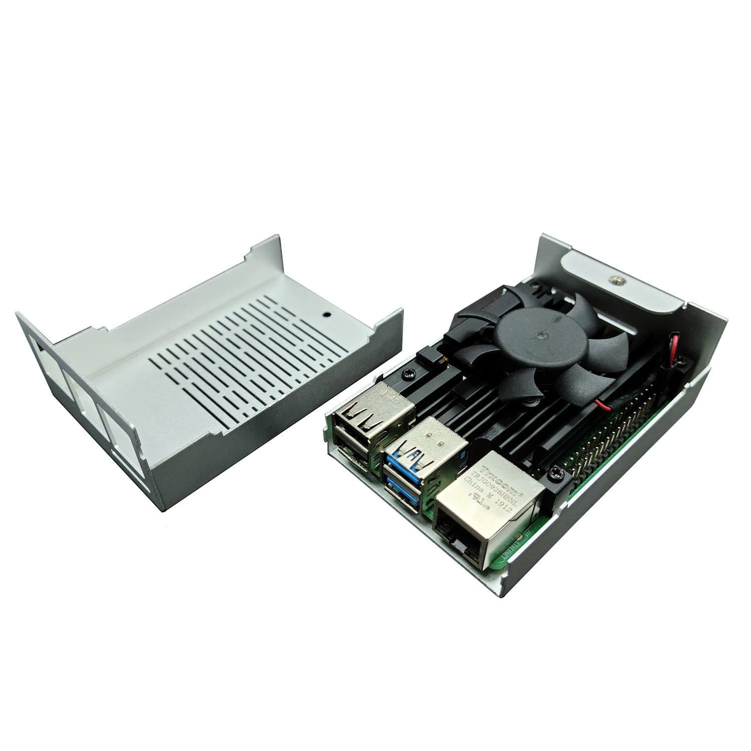 Корпус размерами 91 x 62 x 33,5 мм состоит из двух частей, изготовленных из алюминиевого листа. В верхней части и вдоль линии стыка есть вентиляционные отверстия. В комплект включен алюминиевый радиатор, 50-миллиметровый вентилятор толщиной 10 мм с двойным шарикоподшипником, две теплопроводящие прокладки (для SoC и микросхемы оперативной памяти) и крепежные элементы. Весит все это 120 г. Скорость вращения вентилятора равна 4000 об/мин.